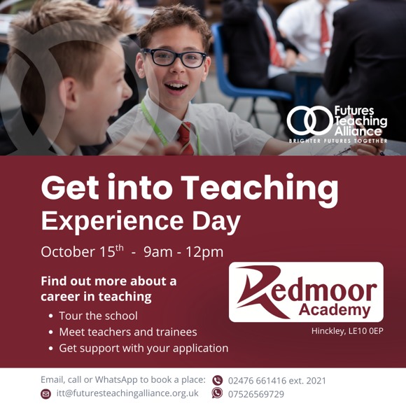 The Experience Events will usually run for three hours. If you are interested in attending one of these days or would like to come in for a visit before then, please email: itt@futuresteachingalliance.org.uk