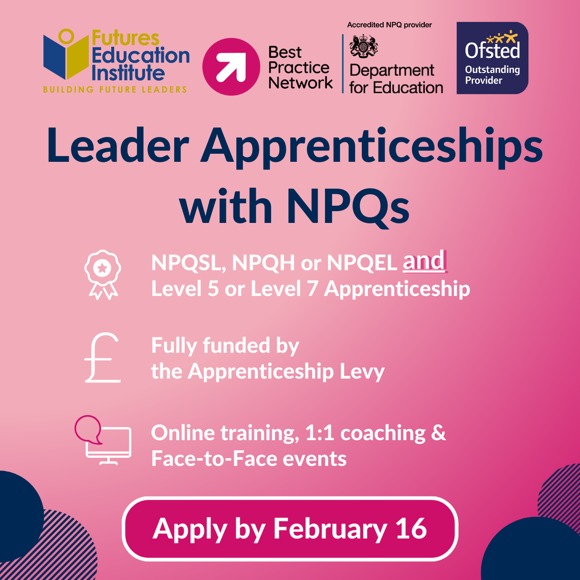 Futures Education Institute are proud to continue as regional delivery partner for Coventry, Warwickshire, Leicestershire and the Midlands and excited to support Best Practice Network's offer of Leader Apprenticeships with NPQs. Don't delay, click here to apply before the 16th February!